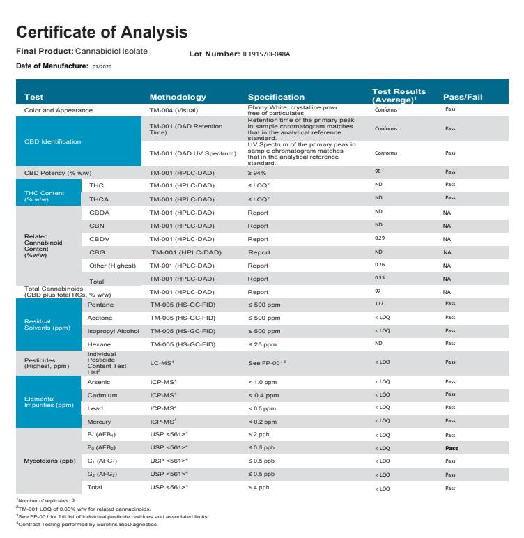 Please find the Latest COAs for our CBD Crystals here: https://www.dropbox.com/home/CBD%20Lab%20Reports/CBD%20Terpsolate%20by%20Central%20Processer